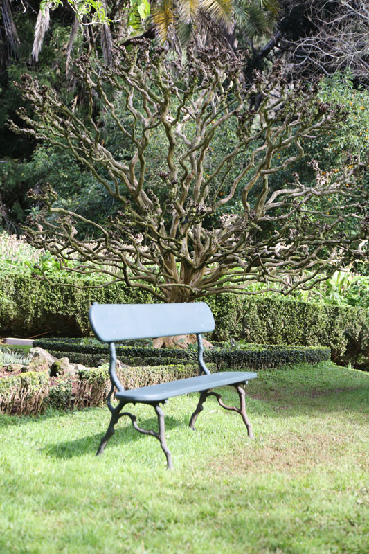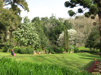 Справа приглашали зайти открытые кованные ворота с монограммой Blandy от которых просматривался большой красивый дом окруженный лужайками, а вдали манили белоснежные цветущие деревья, пальмы и вертикали кипарисов. Но табличка частная территория заставили сердце замереть, неужели нас не пустят туда, к этим великолепным растениям, так экзотически выглядящим на фоне строгого дома в английском стиле. И вот мы уже почти бежим, вдоль канала, через живописный мостик, увитый плетистыми розами, попадаем на нижнюю террасу и замираем от восхищения. Михелия сладкая (Michelia doltsopa) вся покрытая душистыми белоснежными цветами и устлавшая ковром из опавших цветков дорожки словно встречает посетителей сада. Ей вторят начинающие распускаться магнолии и даже газон покрыт маленькими розовыми цветами кислицы. Замшелые ступени ведут в заглубленный сад, огороженный живой изгородью, где в восьмиугольном прудике-зеркальце отражаются причудливые топиары созданные из мюленбекии спутанной (Muehlenbeckia complex). Из каждой ниши выглядывают многочисленные скульптуры, оживляющие пейзаж.