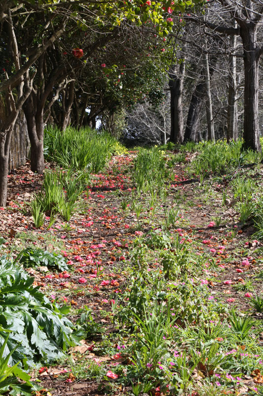 На склоне справа от дома начинается аллея камелий. К огромному сожалению, часть растений пострадало при пожаре 2013 г. в Фуншале. Не возможно без слез смотреть на обгорелые стволы столетних деревьев, но уже пробивается сквозь остатки пожарища новые побеги. «Жажда жизни» должна победить!