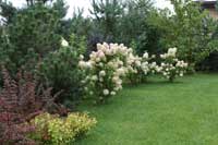 В саду много белого цвета, это и листва дерена белого Элегантиссима, и цветы чубушников, спирей, сиреней, плодовых деревьев и черемух. Лейтмотив сада – гортензии, их зеленовато-белые соцветия прекрасно гармонируют с отделкой зданий и беседки. Белый цвет придает саду легкости, воздушности и наполняет его светом. Но и яркие краски, которые просили добавить заказчики, то же присутствуют. Возле водоема высажены различные сорта ирисов, им вторят фиолетовой волной котовники и шалфеи. Солнечного настроения добавляют спирея японская "Голден Принцесс", многочисленные лилейники. Ассортимент растений составлен с учетом экологических условий произрастания каждого вида, в основу подбора растений положены экологические, эстетические принципы и идея непрерывного цветения сада, которая так понравилась хозяевам.