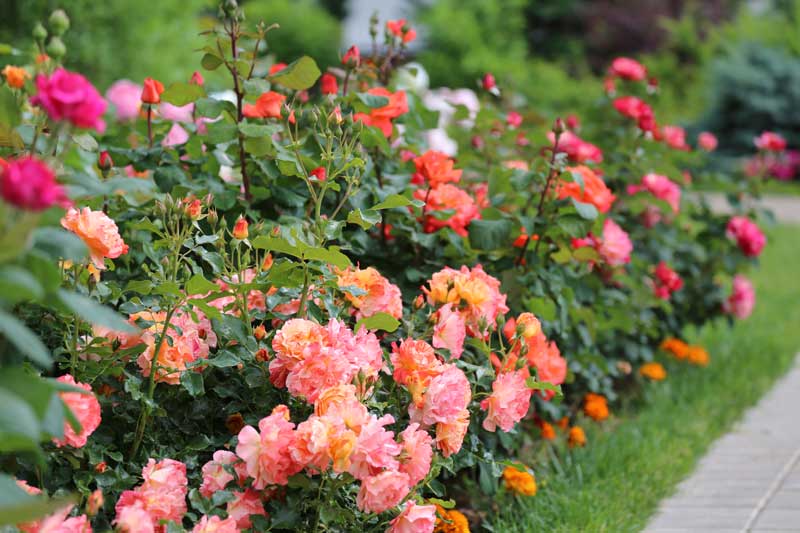 Хозяйка сада – большая любительница роз мечтала о роскошном многоцветном розарии. Под него мы выбрали самое солнечное, защищенное от ветра место возле центрального крыльца. Из всего многообразия сортов выбирали самые устойчивые и неприхотливые. Тщательно подготовленный грунт, дренаж, уход и любовь хозяев делают свое дело - благодарные розы радуют буйным цветением с июня по октябрь. В весенний период, когда розы еще не столь привлекательны, под окнами дома цветут, сменяя друг друга декоративные яблони, различные виды сирени и пионы.