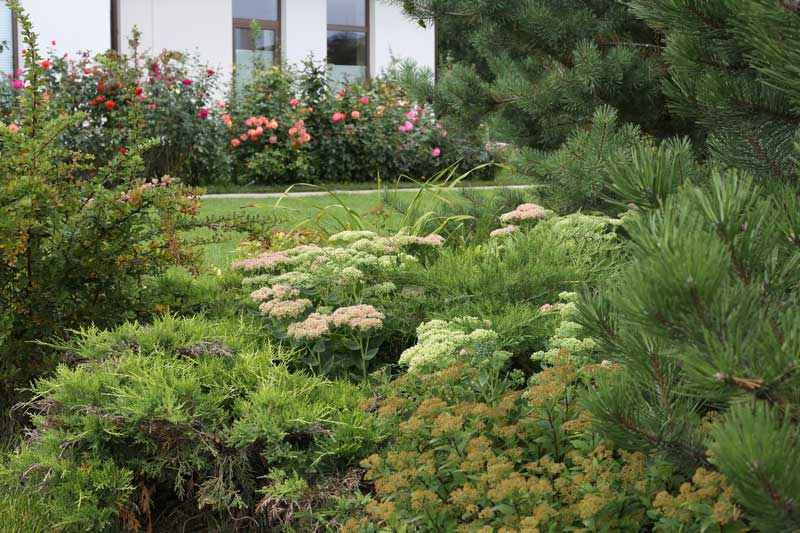 Сад радует яркими красками в течение всего сезона. Но особенно он хорош осенью, когда загораются оранжевым пожаром барбарисы Тунберга, пламенеют бересклеты крылатые, клены Гиннала на золотом фоне берез. И вновь вспоминается картина на стене дома, кажется, что она выплеснулась красками через огромные окна в сад, разбежалась теплыми охристыми тонами по подпорной стенке, деревянной беседке, скамейкам, миксбордерам и растворилась в лесу, окружающем участок.
