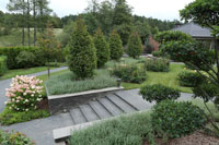 Современный сад - это и новые приемы проектирования, динамичный ритм мощения, контрасты четкой геометрии планировки и природного наполнения, яркого цвета малых архитектурных форм и мягких естественных оттенков многолетников и злаков. Посадки растений массивами, не привязанные к дорожкам, добавляют ощущение спонтанности и природности. Сочетание стриженных форм древесных растений и массивов многолетников усиливает контраст природного и рукотворного.